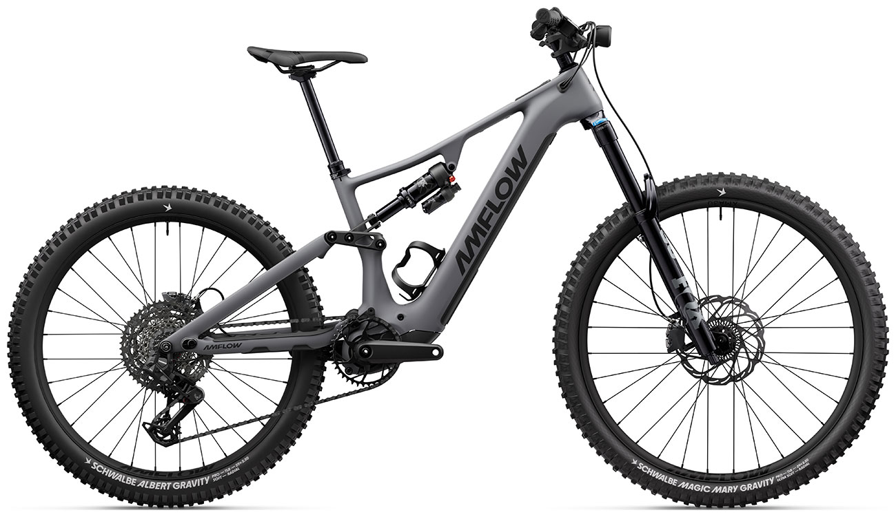 Sunset Cycles offers the 2026 Amflow PR Carbon Pro swappable-battery, full-power electric mountain bike in Basalt Grey finish with up to 48 months 0% finance and free delivery.